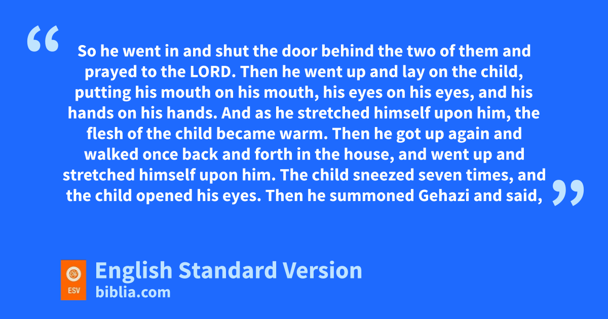 32 When Elisha came into the house, he saw the child lying dead on his bed. 33 So he went in and yshut the door behind the two of them zand prayed to the Lord. 34 Then he went up and lay on the child, putting his mouth on his mouth, his eyes on his eyes, and his hands on his hands. And as ahe stretched himself upon him, the flesh of the child became warm. 35 Then he got up again and walked once back and forth in the house, and went up aand stretched himself upon him. The child sneezed seven times, and the child opened his eyes. 36 Then he summoned Gehazi and said, “Call this Shunammite.” So he called her. And when she came to him, he said, “Pick up your son.” 37 She came and fell at his feet, bowing to the ground. bThen she picked up her son and went out.