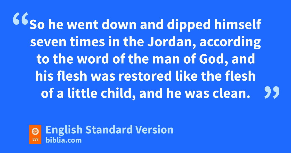 8 But when Elisha the tman of God heard that the king of Israel had torn his clothes, he sent to the king, saying, “Why have you torn your clothes? Let him come now to me, that he may know that there is a prophet in Israel.” 9 So Naaman came with his horses and chariots and stood at the door of Elisha’s house. 10 And Elisha sent a messenger to him, saying, u“Go and wash in the Jordan seven times, and your flesh shall be restored, and you shall be clean.” 11 But Naaman was angry and went away, saying, “Behold, I thought that he would surely come out to me and stand and call upon the name of the Lord his God, and wave his hand over the place and cure the leper. 12 Are not Abana3 and Pharpar, the rivers of vDamascus, better than all the waters of Israel? Could I not wash in them and be clean?” So he turned and went away in a rage. 13 But his servants came near and said to him, w“My father, it is a great word the prophet has spoken to you; will you not do it? Has he actually said to you, ‘Wash, and be clean’?” 14 So he went down and dipped himself seven times in the Jordan, according to the word of the man of God, xand his flesh was restored like the flesh of a little child, yand he was clean.