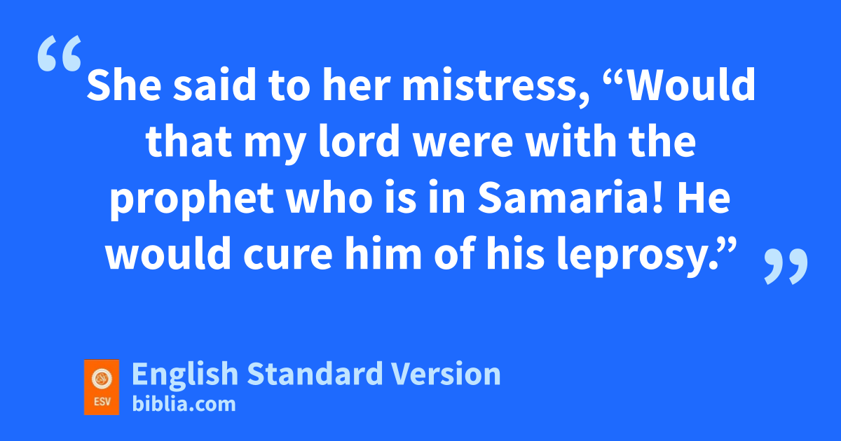 5 lNaaman, mcommander of the army of the king of Syria, was a great man with his master and in high favor, because by him the Lord had given victory to Syria. He was a mighty man of valor, but he was a leper.1 2 Now the Syrians on none of their raids had carried off a little girl from the land of Israel, and she worked in the service of Naaman’s wife. 3 She said to her mistress, “Would that my lord were with the prophet who is in Samaria! He would cure him of his leprosy.” 4 So Naaman went in and told his lord, “Thus and so spoke the girl from the land of Israel.” 5 And the king of Syria said, “Go now, and I will send a letter to the king of Israel.”