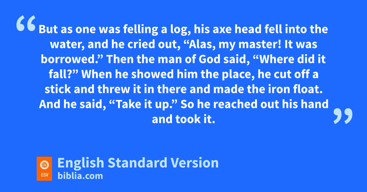 6 Now nthe sons of the prophets said to Elisha, “See, the place where we dwell under your charge is too small for us. 2 Let us go to the Jordan and each of us get there a log, and let us make a place for us to dwell there.” And he answered, “Go.” 3 Then one of them said, “Be pleased to go with your servants.” And he answered, “I will go.” 4 So he went with them. And when they came to the Jordan, they cut down trees. 5 But as one was felling a log, his axe head fell into the water, and he cried out, “Alas, my master! It was borrowed.” 6 Then the man of God said, “Where did it fall?” When he showed him the place, ohe cut off a stick and threw it in there and made the iron float. 7 And he said, “Take it up.” So he reached out his hand and took it.