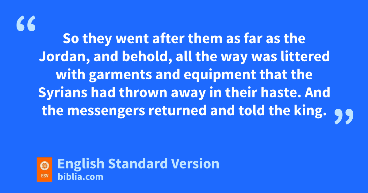 9 Then they said to one another, “We are not doing right. This day is a day of good news. If we are silent and wait until the morning light, punishment will overtake us. Now therefore come; let us go and tell the king’s household.” 10 So they came and called to the gatekeepers of the city and told them, “We came to the camp of the Syrians, and behold, there was no one to be seen or heard there, nothing but the horses tied and the donkeys tied and the tents as they were.” 11 Then the gatekeepers called out, and it was told within the king’s household. 12 And the king rose in the night and said to his servants, “I will tell you what the Syrians have done to us. They know that we are hungry. Therefore they have gone out of the camp to hide themselves in the open country, thinking, ‘When they come out of the city, we shall take them alive and get into the city.’ ” 13 And one of his servants said, “Let some men take five of the remaining horses, seeing that those who are left here will fare like the whole multitude of Israel who have already perished. Let us send and see.” 14 So they took two horsemen, and the king sent them after the army of the Syrians, saying, “Go and see.” 15 So they went after them as far as the Jordan, and behold, all the way was littered with garments and equipment that the Syrians had thrown away in their haste. And the messengers returned and told the king.