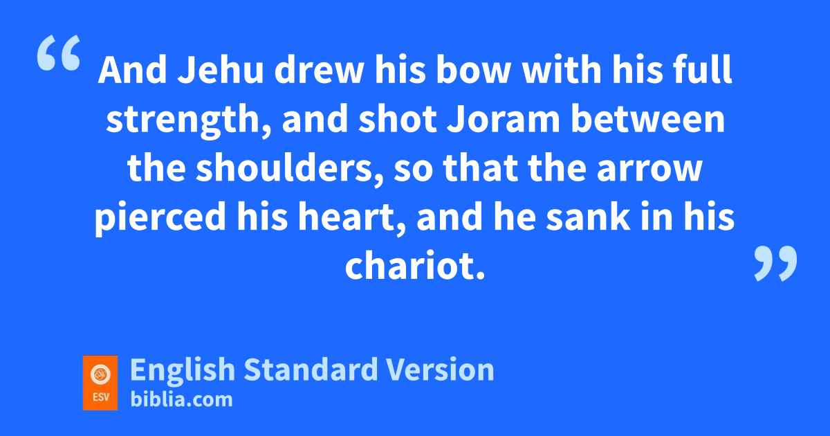 21 Joram said, z“Make ready.” And they made ready his chariot. aThen Joram king of Israel and Ahaziah king of Judah set out, each in his chariot, and went to meet Jehu, and met him bat the property of Naboth the Jezreelite. 22 And when Joram saw Jehu, he said, “Is it peace, Jehu?” He answered, “What peace can there be, so long as cthe whorings and the sorceries of your mother Jezebel are so many?” 23 Then Joram reined about and fled, saying to Ahaziah, “Treachery, O Ahaziah!” 24 And Jehu drew his bow with his full strength, and shot Joram between the shoulders, so that the arrow pierced his heart, and he sank in his chariot. 25 Jehu said to Bidkar dhis aide, “Take him up and throw him bon the plot of ground belonging to Naboth the Jezreelite. For remember, when you and I rode side by side behind Ahab his father, how ethe Lord made this fpronouncement against him: 26 ‘As surely as I saw yesterday the blood of Naboth and the blood of his sons—declares the Lord—I will repay you on this plot of ground.’ Now therefore take him up and throw him on the plot of ground, in accordance with the word of the Lord.”