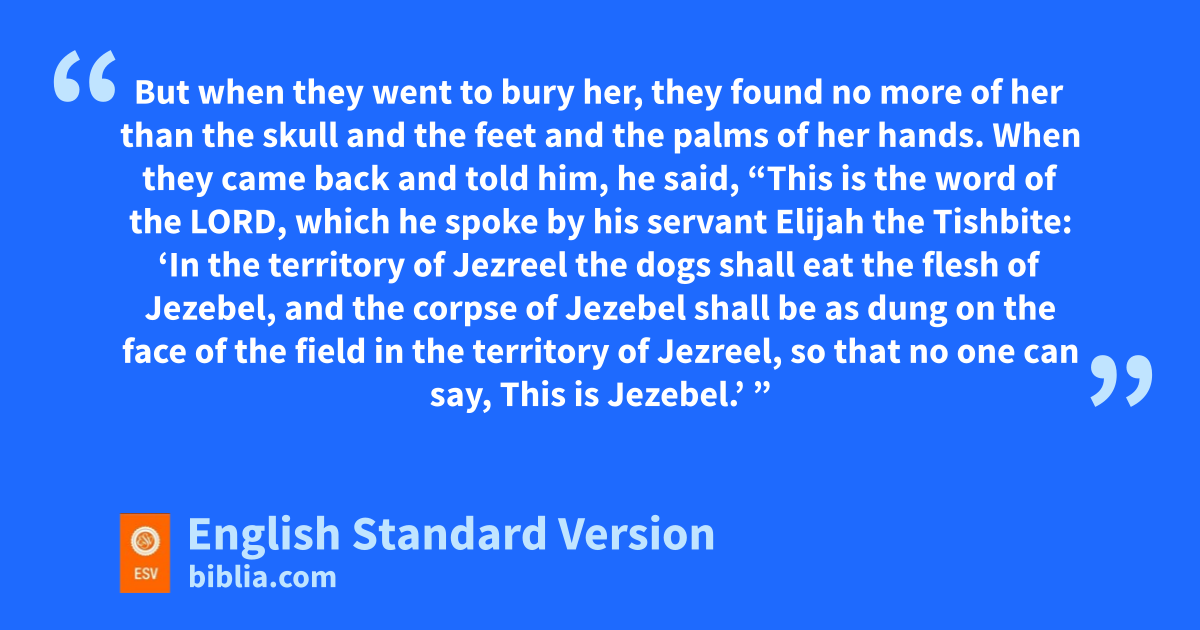 30 When Jehu came to Jezreel, Jezebel heard of it. And kshe painted her eyes and adorned her head and looked out of the window. 31 And as Jehu entered the gate, she said, l“Is it peace, you Zimri, murderer of your master?” 32 And he lifted up his face to the window and said, “Who is on my side? Who?” Two or three eunuchs looked out at him. 33 He said, “Throw her down.” So they threw her down. And some of her blood spattered on the wall and on the horses, and they trampled on her. 34 Then he went in and ate and drank. And he said, “See now to this cursed woman and bury her, mfor she is a king’s daughter.” 35 But when they went to bury her, they found no more of her than the skull and the feet and the palms of her hands. 36 When they came back and told him, he said, “This is the word of the Lord, which he spoke by his servant Elijah the Tishbite: n‘In the territory of Jezreel the dogs shall eat the flesh of Jezebel, 37 and the corpse of Jezebel shall be oas dung on the face of the field in the territory of Jezreel, so that no one can say, This is Jezebel.’ ”