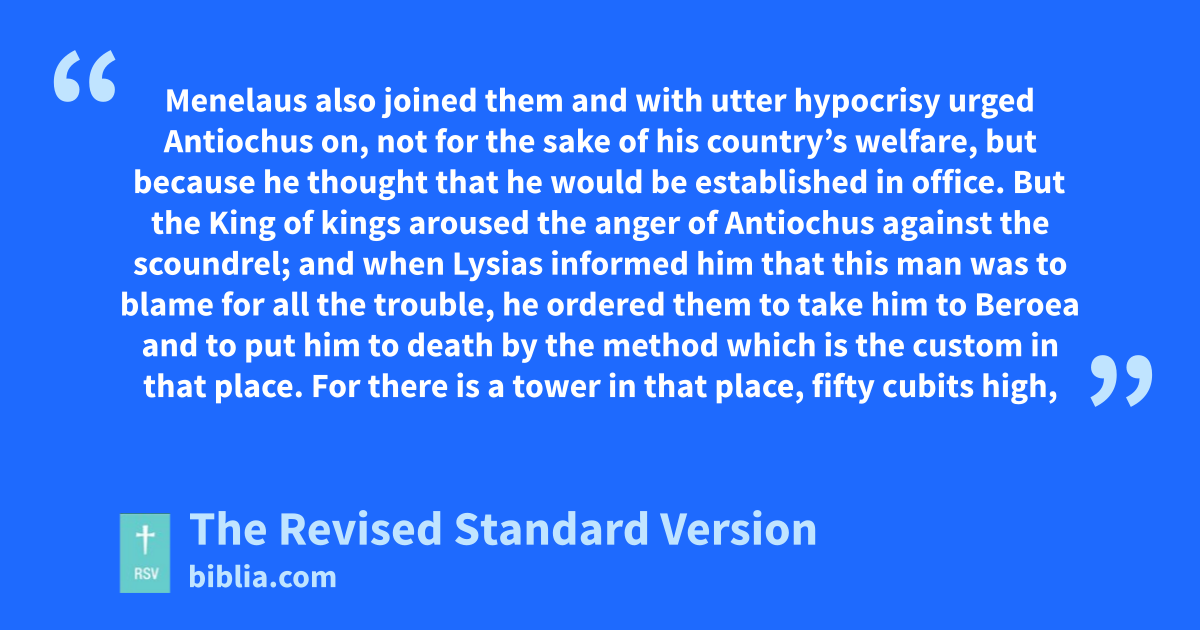 3 Menelaus also joined them and with utter hypocrisy urged Antiochus on, not for the sake of his country’s welfare, but because he thought that he would be established in office. 4 But the King of kings aroused the anger of Antiochus against the scoundrel; and when Lysias informed him that this man was to blame for all the trouble, he ordered them to take him to Beroea and to put him to death by the method which is the custom in that place. 5 For there is a tower in that place, fifty cubits high, full of ashes, and it has a rim running around it which on all sides inclines precipitously into the ashes. 6 There they all push to destruction any man guilty of sacrilege or notorious for other crimes. 7 By such a fate it came about that Menelaus the lawbreaker died, without even burial in the earth. 8 And this was eminently just; because he had committed many sins against the altar whose fire and ashes were holy, he met his death in ashes.
