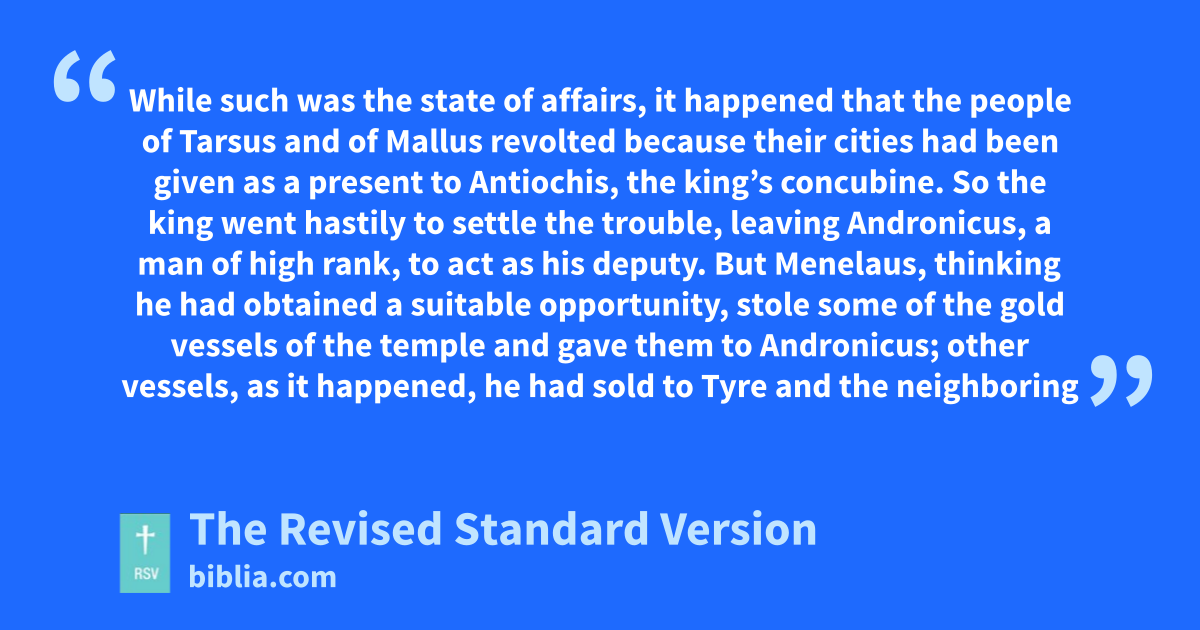 30 While such was the state of affairs, it happened that the people of Tarsus and of Mallus revolted because their cities had been given as a present to Antiochis, the king’s concubine. 31 So the king went hastily to settle the trouble, leaving Andronicus, a man of high rank, to act as his deputy. 32 But Menelaus, thinking he had obtained a suitable opportunity, stole some of the gold vessels of the temple and gave them to Andronicus; other vessels, as it happened, he had sold to Tyre and the neighboring cities. 33 When Onias became fully aware of these acts he publicly exposed them, having first withdrawn to a place of sanctuary at Daphne near Antioch. 34 Therefore Menelaus, taking Andronicus aside, urged him to kill Onias. Andronicus came to Onias, and resorting to treachery offered him sworn pledges and gave him his right hand, and in spite of his suspicion persuaded Onias to come out from the place of sanctuary; then, with no regard for justice, he immediately put him out of the way. 35 For this reason not only Jews, but many also of other nations, were grieved and displeased at the unjust murder of the man. 36 When the king returned from the region of Cilicia, the Jews in the city appealed to him with regard to the unreasonable murder of Onias, and the Greeks shared their hatred of the crime. 37 Therefore Antiochus was grieved at heart and filled with pity, and wept because of the moderation and good conduct of the deceased; 38 and inflamed with anger, he immediately stripped off the purple robe from Andronicus, tore off his garments, and led him about the whole city to that very place where he had committed the outrage against Onias, and there he dispatched the bloodthirsty fellow. The Lord thus repaid him with the punishment he deserved.