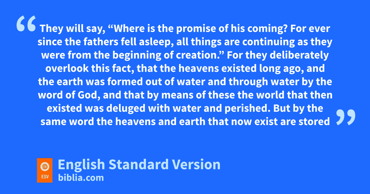 3 This is now the second letter that I am writing to you, beloved. In both of them gI am stirring up your sincere mind by way of reminder, 2 hthat you should remember the predictions of ithe holy prophets and the commandment of the Lord and Savior through your apostles, 3 knowing this first of all, that scoffers will come jin the last days with scoffing, kfollowing their own sinful desires. 4 lThey will say, “Where is the promise of mhis coming? For ever since the fathers fell asleep, all things are continuing as they were from the beginning of creation.” 5 For they deliberately overlook this fact, that the heavens existed long ago, and the earth nwas formed out of water and through water oby the word of God, 6 and that by means of these the world that then existed pwas deluged with water and qperished. 7 But by the same word rthe heavens and earth that now exist are stored up for fire, being kept until the day of judgment and sdestruction of the ungodly.