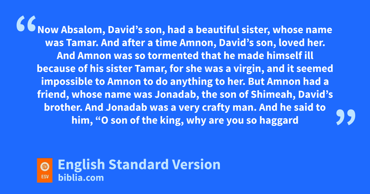 13 Now wAbsalom, David’s son, had a beautiful sister, whose name was xTamar. And after a time Amnon, David’s son, loved her. 2 And Amnon was so tormented that he made himself ill because of his sister Tamar, for she was a virgin, and it seemed impossible to Amnon to do anything to her. 3 But Amnon had a friend, whose name was Jonadab, the son of yShimeah, David’s brother. And Jonadab was a very crafty man. 4 And he said to him, “O son of the king, why are you so haggard morning after morning? Will you not tell me?” Amnon said to him, “I love Tamar, my brother Absalom’s sister.” 5 Jonadab said to him, “Lie down on your bed and pretend to be ill. And when your father comes to see you, say to him, ‘Let my sister Tamar come and give me bread to eat, and prepare the food in my sight, that I may see it and eat it from her hand.’ ” 6 So Amnon lay down and pretended to be ill. And when the king came to see him, Amnon said to the king, “Please let my sister Tamar come and zmake a couple of cakes in my sight, that I may eat from her hand.”