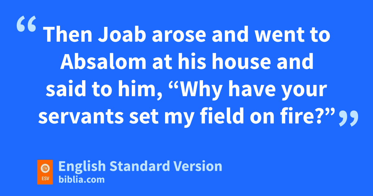 28 So Absalom lived two full years in Jerusalem, without coming into the king’s presence. 29 Then Absalom sent for Joab, to send him to the king, but Joab would not come to him. And he sent a second time, but Joab would not come. 30 Then he said to his servants, “See, Joab’s field is next to mine, and he has barley there; go and set it on fire.” So Absalom’s servants set the field on fire.2 31 Then Joab arose and went to Absalom at his house and said to him, “Why have your servants set my field on fire?” 32 Absalom answered Joab, “Behold, I sent word to you, ‘Come here, that I may send you to the king, to ask, “Why have I come from qGeshur? It would be better for me to be there still.” Now therefore let me go into the presence of the king, uand if there is guilt in me, let him put me to death.’ ” 33 Then Joab went to the king and told him, and he summoned Absalom. So he came to the king and bowed himself on his face to the ground before the king, and the king kissed Absalom.
