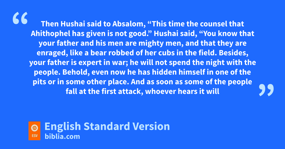 5 Then Absalom said, “Call sHushai the Archite also, and let us hear what he has to say.” 6 And when Hushai came to Absalom, Absalom said to him, “Thus has Ahithophel spoken; shall we do as he says? If not, you speak.” 7 Then Hushai said to Absalom, “This time the counsel that Ahithophel has given is not good.” 8 Hushai said, “You know that your father and his men are mighty men, and that they are enraged,2 tlike a bear robbed of her cubs in the field. Besides, your father is expert in war; he will not spend the night with the people. 9 Behold, even now he has hidden himself in one of the pits or in some other place. And as soon as some of the people fall3 at the first attack, whoever hears it will say, ‘There has been a slaughter among the people who follow Absalom.’ 10 Then even the valiant man, whose heart is like the heart of a lion, will utterly umelt with fear, for all Israel knows that your father is a mighty man, and that those who are with him are valiant men. 11 But my counsel is that all Israel be gathered to you, vfrom Dan to Beersheba, was the sand by the sea for multitude, and that you go to battle in person. 12 So we shall come upon him in some place where he is to be found, and we shall light upon him as the dew falls on the ground, and of him and all the men with him not one will be left. 13 If he withdraws into a city, then all Israel will bring ropes to that city, and we shall drag it into the valley, until not even a pebble is to be found there.” 14 And Absalom and all the men of Israel said, “The counsel of Hushai the Archite is better than the counsel of Ahithophel.” xFor the Lord had ordained4 to defeat the good counsel of Ahithophel, so that the Lord might bring harm upon Absalom.
