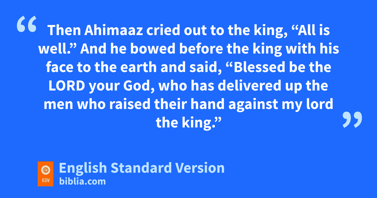 28 Then Ahimaaz cried out to the king, “All is well.” And he bowed before the king with his face to the earth and said, k“Blessed be the Lord your God, who has delivered up the men who raised their hand against my lord the king.” 29 And the king said, l“Is it well with the young man Absalom?” Ahimaaz answered, “When Joab sent the king’s servant, your servant, I saw a great commotion, but I do not know what it was.” 30 And the king said, “Turn aside and stand here.” So he turned aside and stood still.