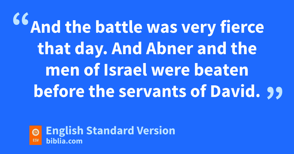 12 Abner the son of Ner, and the servants of Ish-bosheth the son of Saul, went out from Mahanaim to Gibeon. 13 And Joab the son of Zeruiah and the servants of David went out and met them at othe pool of Gibeon. And they sat down, the one on the one side of the pool, and the other on the other side of the pool. 14 And Abner said to Joab, “Let the young men arise and compete before us.” And Joab said, “Let them arise.” 15 Then they arose and passed over by number, twelve for Benjamin and Ish-bosheth the son of Saul, and twelve of the servants of David. 16 And each caught his opponent by the head and thrust his sword in his opponent’s side, so they fell down together. Therefore that place was called Helkath-hazzurim,1 which is at Gibeon. 17 And the battle was very fierce that day. And Abner and the men of Israel were beaten before the servants of David.