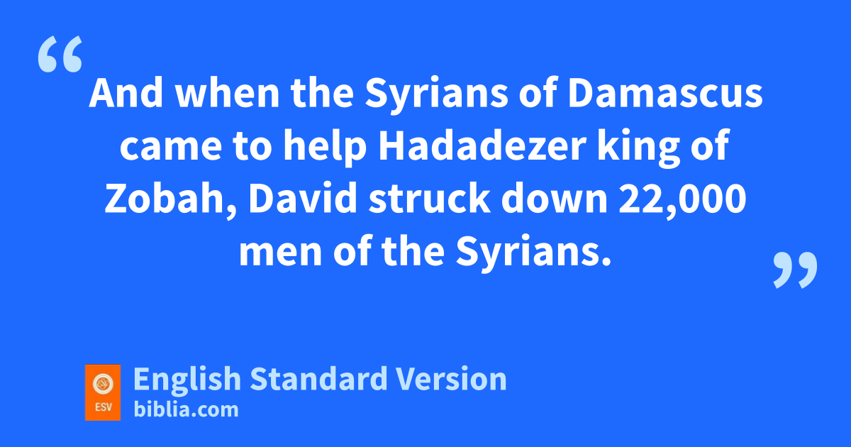 3 David also defeated lHadadezer the son of Rehob, king of mZobah, as he went to restore his power at the river Euphrates. 4 nAnd David took from him 1,700 horsemen, and 20,000 foot soldiers. And David ohamstrung all the chariot horses but left enough for 100 chariots. 5 pAnd when the qSyrians of Damascus came to help lHadadezer king of mZobah, David struck down 22,000 men of the Syrians. 6 Then David put garrisons in Aram of Damascus, and the Syrians rbecame servants to David and brought tribute. sAnd the Lord gave victory to David wherever he went. 7 And David took tthe shields of gold that were carried by the servants of Hadadezer and brought them to Jerusalem. 8 And from Betah and from Berothai, cities of Hadadezer, King David took very much bronze.