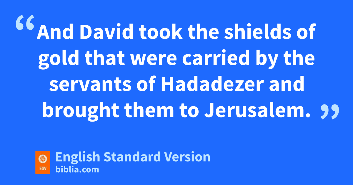 3 David also defeated lHadadezer the son of Rehob, king of mZobah, as he went to restore his power at the river Euphrates. 4 nAnd David took from him 1,700 horsemen, and 20,000 foot soldiers. And David ohamstrung all the chariot horses but left enough for 100 chariots. 5 pAnd when the qSyrians of Damascus came to help lHadadezer king of mZobah, David struck down 22,000 men of the Syrians. 6 Then David put garrisons in Aram of Damascus, and the Syrians rbecame servants to David and brought tribute. sAnd the Lord gave victory to David wherever he went. 7 And David took tthe shields of gold that were carried by the servants of Hadadezer and brought them to Jerusalem. 8 And from Betah and from Berothai, cities of Hadadezer, King David took very much bronze.
