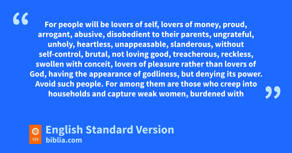 3 But understand this, that yin the last days there will come times of difficulty. 2 For people will be zlovers of self, alovers of money, bproud, barrogant, abusive, bdisobedient to their parents, ungrateful, unholy, 3 cheartless, unappeasable, slanderous, without self-control, brutal, dnot loving good, 4 treacherous, reckless, eswollen with conceit, flovers of pleasure rather than lovers of God, 5 having the appearance of godliness, but gdenying its power. hAvoid such people. 6 For among them are ithose who creep into households and capture weak women, burdened with sins and led astray by various passions, 7 always learning and never able to jarrive at a knowledge of the truth. 8 Just as kJannes and Jambres lopposed Moses, so these men also oppose the truth, mmen corrupted in mind and ndisqualified regarding the faith. 9 But they will not get very far, for their folly will be plain to all, oas was that of those two men.