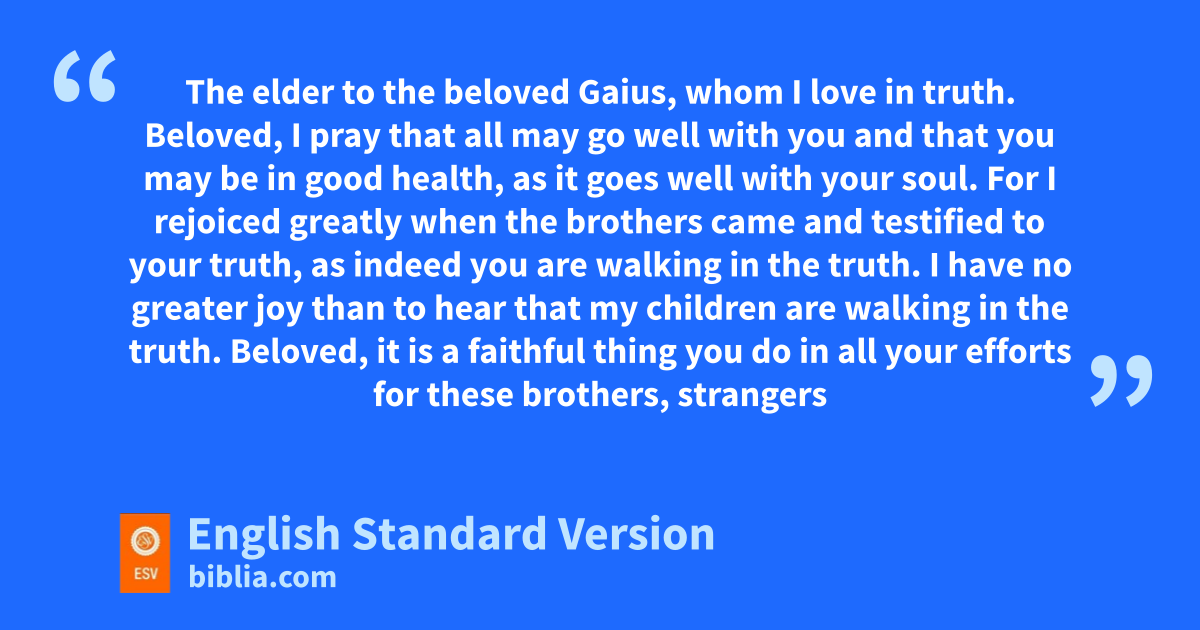 2 Beloved, I pray that all may go well with you and that you may be in good health, as it goes well with your soul. 3 For cI rejoiced greatly when the brothers1 came and testified to your truth, as indeed you are walking in the truth. 4 I have no greater joy than to hear that dmy children are walking in the truth.