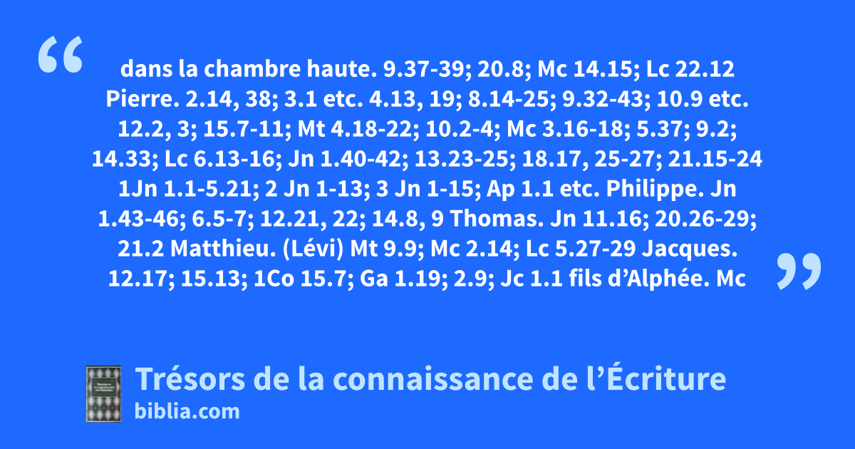 dans la chambre haute. 9.37-39; 20.8; Mc 14.15; Lc 22.12 Pierre. 2.14, 38; 3.1 etc. 4.13, 19; 8.14-25; 9.32-43; 10.9 etc. 12.2, 3; 15.7-11; Mt 4.18-22; 10.2-4; Mc 3.16-18; 5.37; 9.2; 14.33; Lc 6.13-16; Jn 1.40-42; 13.23-25; 18.17, 25-27; 21.15-24 1Jn 1.1-5.21; 2 Jn 1-13; 3 Jn 1-15; Ap 1.1 etc. Philippe. Jn 1.43-46; 6.5-7; 12.21, 22; 14.8, 9 Thomas. Jn 11.16; 20.26-29; 21.2 Matthieu. (Lévi) Mt 9.9; Mc 2.14; Lc 5.27-29 Jacques. 12.17; 15.13; 1Co 15.7; Ga 1.19; 2.9; Jc 1.1 fils d’Alphée. Mc 2.14; 3.18 Simon. Mt 10.4; Mc 3.18 le Zélote. Lc 6.15 Jude. Mt 10.3 Lebbée, surnommé Thaddée. Mc 3.18; Jd 1
