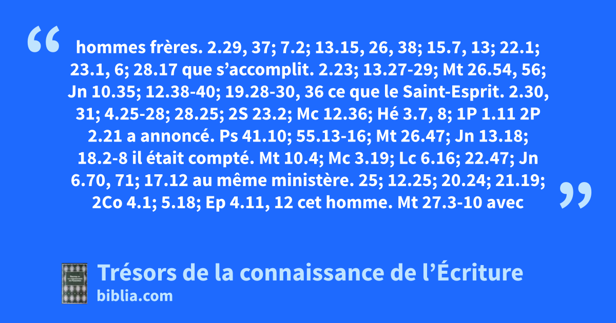 hommes frères. 2.29, 37; 7.2; 13.15, 26, 38; 15.7, 13; 22.1; 23.1, 6; 28.17 que s’accomplit. 2.23; 13.27-29; Mt 26.54, 56; Jn 10.35; 12.38-40; 19.28-30, 36 ce que le Saint-Esprit. 2.30, 31; 4.25-28; 28.25; 2S 23.2; Mc 12.36; Hé 3.7, 8; 1P 1.11 2P 2.21 a annoncé. Ps 41.10; 55.13-16; Mt 26.47; Jn 13.18; 18.2-8