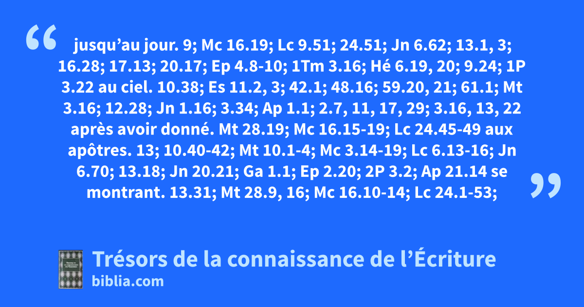 jusqu’au jour. 9; Mc 16.19; Lc 9.51; 24.51; Jn 6.62; 13.1, 3; 16.28; 17.13; 20.17; Ep 4.8-10; 1Tm 3.16; Hé 6.19, 20; 9.24; 1P 3.22 au ciel. 10.38; Es 11.2, 3; 42.1; 48.16; 59.20, 21; 61.1; Mt 3.16; 12.28; Jn 1.16; 3.34; Ap 1.1; 2.7, 11, 17, 29; 3.16, 13, 22 après avoir donné. Mt 28.19; Mc 16.15-19; Lc 24.45-49 aux apôtres. 13; 10.40-42; Mt 10.1-4; Mc 3.14-19; Lc 6.13-16; Jn 6.70; 13.18; Jn 20.21; Ga 1.1; Ep 2.20; 2P 3.2; Ap 21.14