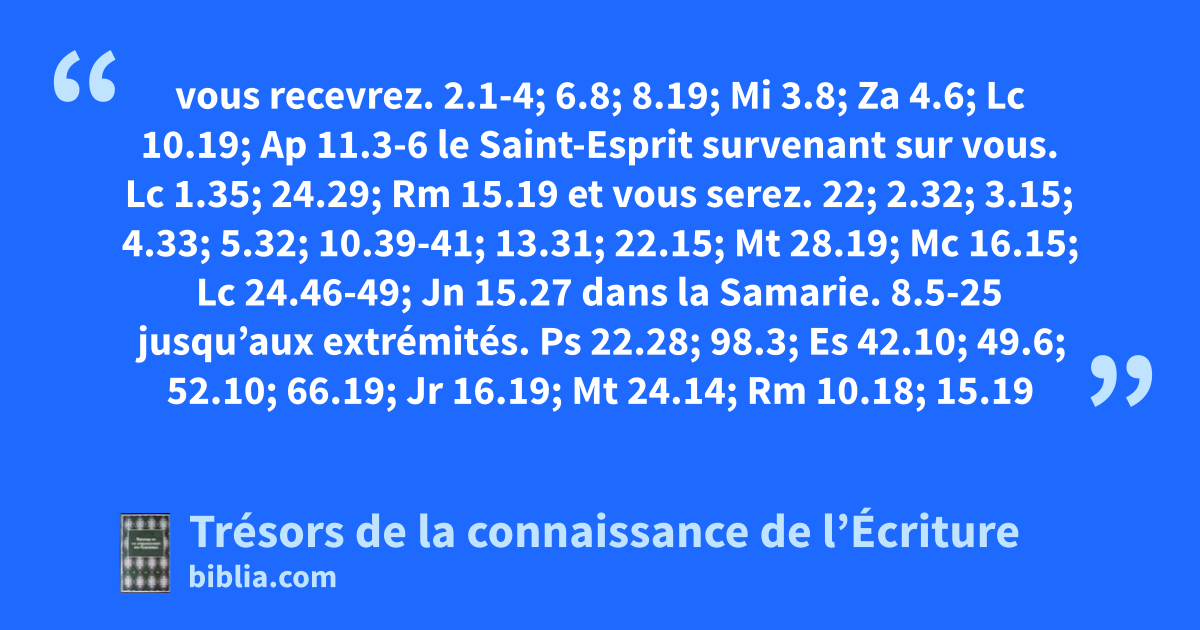 vous recevrez. 2.1-4; 6.8; 8.19; Mi 3.8; Za 4.6; Lc 10.19; Ap 11.3-6 le Saint-Esprit survenant sur vous. Lc 1.35; 24.29; Rm 15.19 et vous serez. 22; 2.32; 3.15; 4.33; 5.32; 10.39-41; 13.31; 22.15; Mt 28.19; Mc 16.15; Lc 24.46-49; Jn 15.27 dans la Samarie. 8.5-25 jusqu’aux extrémités. Ps 22.28; 98.3; Es 42.10; 49.6; 52.10; 66.19; Jr 16.19; Mt 24.14; Rm 10.18; 15.19
