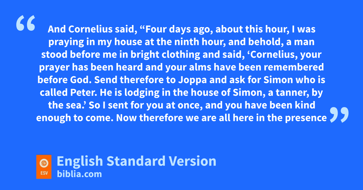 30 And Cornelius said, b“Four days ago, about this hour, I was praying in my house at cthe ninth hour,4 and behold, da man stood before me in bright clothing 31 and said, ‘Cornelius, eyour prayer has been heard and your alms have been remembered before God. 32 Send therefore to Joppa and ask for Simon who is called Peter. He is lodging in the house of Simon, a tanner, by the sea.’ 33 So I sent for you at once, and you have been kind enough to come. Now therefore we are all here in the presence of God to hear all that you have been commanded by the Lord.”