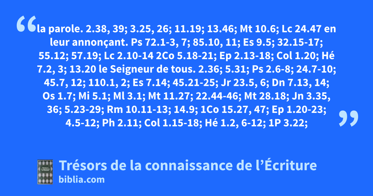 la parole. 2.38, 39; 3.25, 26; 11.19; 13.46; Mt 10.6; Lc 24.47 en leur annonçant. Ps 72.1-3, 7; 85.10, 11; Es 9.5; 32.15-17; 55.12; 57.19; Lc 2.10-14 2Co 5.18-21; Ep 2.13-18; Col 1.20; Hé 7.2, 3; 13.20 le Seigneur de tous. 2.36; 5.31; Ps 2.6-8; 24.7-10; 45.7, 12; 110.1, 2; Es 7.14; 45.21-25; Jr 23.5, 6; Dn 7.13, 14; Os 1.7; Mi 5.1; Ml 3.1; Mt 11.27; 22.44-46; Mt 28.18; Jn 3.35, 36; 5.23-29; Rm 10.11-13; 14.9; 1Co 15.27, 47; Ep 1.20-23; 4.5-12; Ph 2.11; Col 1.15-18; Hé 1.2, 6-12; 1P 3.22; Ap 1.5, 18; 17.14; 19.16