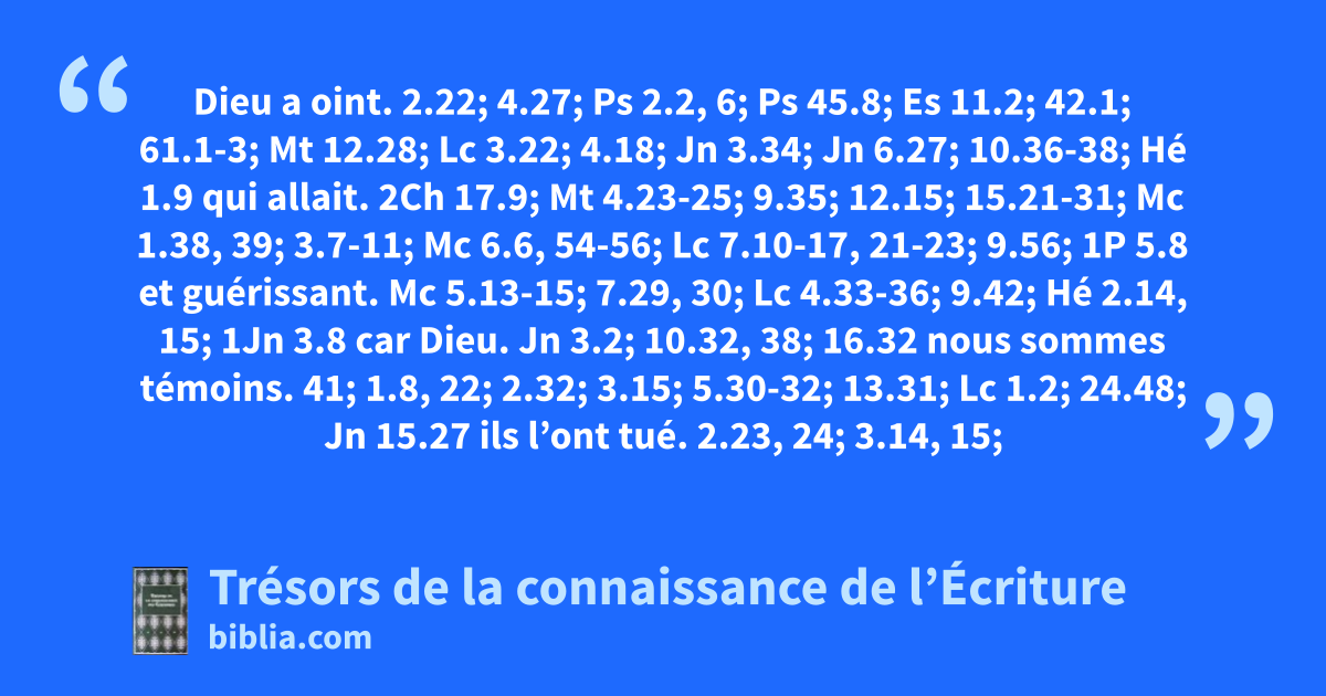 Dieu a oint. 2.22; 4.27; Ps 2.2, 6; Ps 45.8; Es 11.2; 42.1; 61.1-3; Mt 12.28; Lc 3.22; 4.18; Jn 3.34; Jn 6.27; 10.36-38; Hé 1.9 qui allait. 2Ch 17.9; Mt 4.23-25; 9.35; 12.15; 15.21-31; Mc 1.38, 39; 3.7-11; Mc 6.6, 54-56; Lc 7.10-17, 21-23; 9.56; 1P 5.8 et guérissant. Mc 5.13-15; 7.29, 30; Lc 4.33-36; 9.42; Hé 2.14, 15; 1Jn 3.8 car Dieu. Jn 3.2; 10.32, 38; 16.32