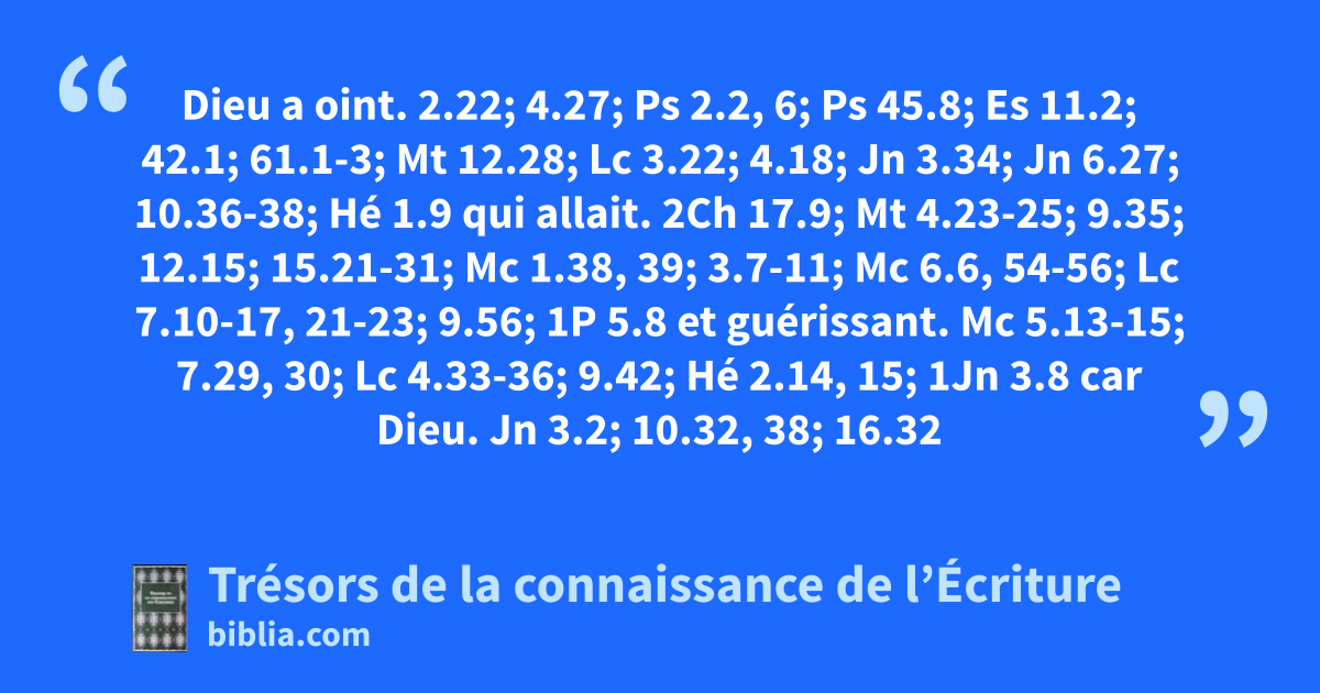 Dieu a oint. 2.22; 4.27; Ps 2.2, 6; Ps 45.8; Es 11.2; 42.1; 61.1-3; Mt 12.28; Lc 3.22; 4.18; Jn 3.34; Jn 6.27; 10.36-38; Hé 1.9 qui allait. 2Ch 17.9; Mt 4.23-25; 9.35; 12.15; 15.21-31; Mc 1.38, 39; 3.7-11; Mc 6.6, 54-56; Lc 7.10-17, 21-23; 9.56; 1P 5.8 et guérissant. Mc 5.13-15; 7.29, 30; Lc 4.33-36; 9.42; Hé 2.14, 15; 1Jn 3.8 car Dieu. Jn 3.2; 10.32, 38; 16.32