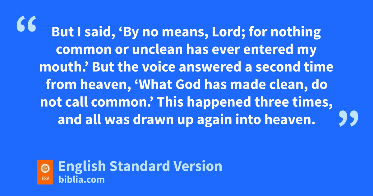 11 Now the apostles and rthe brothers1 who were throughout Judea heard that the Gentiles also had received the word of God. 2 So when Peter went up to Jerusalem, sthe circumcision party2 criticized him, saying, 3 t“You went to uncircumcised men and uate with them.” 4 But Peter began and explained it to them in order: 5 v“I was in the city of Joppa praying, and in a trance I saw a vision, something like a great sheet descending, being let down from heaven by its four corners, and it came down to me. 6 Looking at it closely, I observed animals and beasts of prey and reptiles and birds of the air. 7 And I heard a voice saying to me, ‘Rise, Peter; kill and eat.’ 8 But I said, ‘By no means, Lord; for nothing common or unclean has ever entered my mouth.’ 9 But the voice answered a second time from heaven, ‘What God has made clean, do not call common.’ 10 This happened three times, and all was drawn up again into heaven. 11 And behold, at that very moment three men arrived at the house in which we were, sent to me from Caesarea. 12 And the Spirit told me to go with them, wmaking no distinction. xThese six brothers also accompanied me, and we entered the man’s house. 13 And he told us how he had seen the angel stand in his house and say, ‘Send to Joppa and bring Simon who is called Peter; 14 yhe will declare to you a message by which zyou will be saved, you and all your household.’ 15 As I began to speak, athe Holy Spirit fell on them bjust as on us at the beginning. 16 And I remembered the word of the Lord, how he said, c‘John baptized with water, but you will be baptized with the Holy Spirit.’ 17 If then dGod gave ethe same gift to them as he gave to us fwhen we believed in the Lord Jesus Christ, gwho was I hthat I could stand in God’s way?” 18 When they heard these things they fell silent. And they iglorified God, saying, j“Then to the Gentiles also God has kgranted lrepentance that leads to life.”