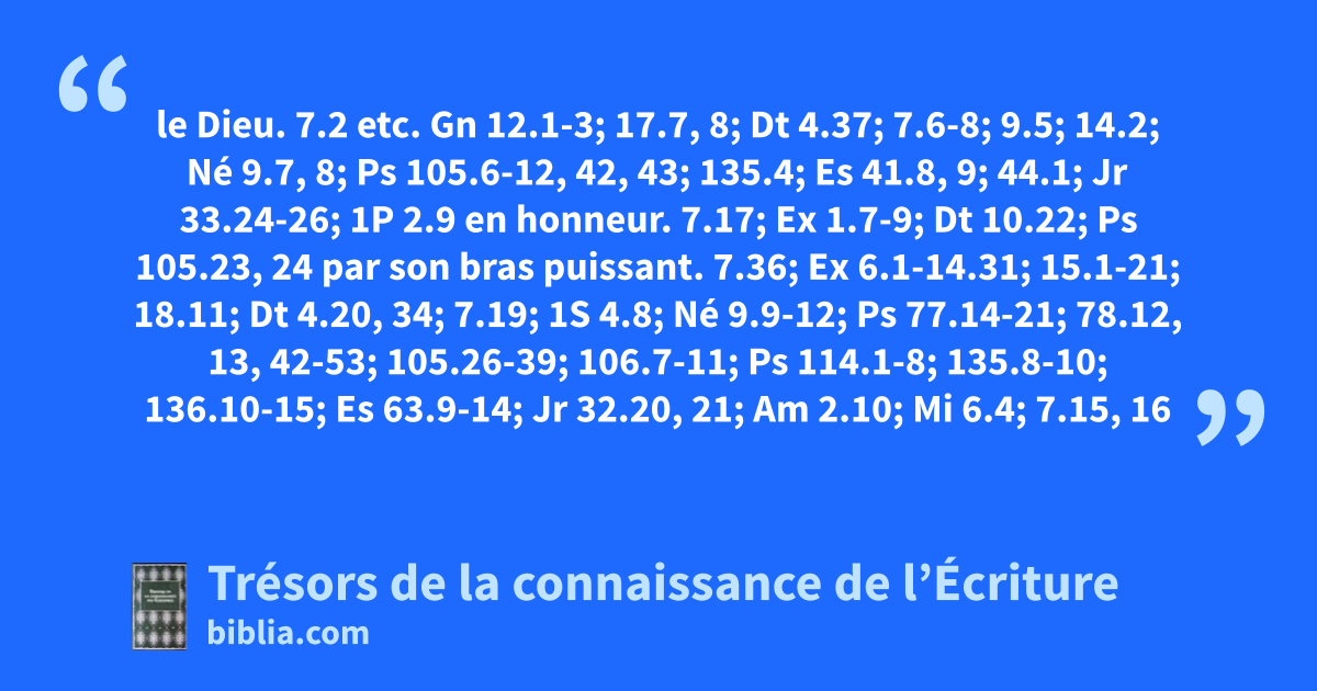 le Dieu. 7.2 etc. Gn 12.1-3; 17.7, 8; Dt 4.37; 7.6-8; 9.5; 14.2; Né 9.7, 8; Ps 105.6-12, 42, 43; 135.4; Es 41.8, 9; 44.1; Jr 33.24-26; 1P 2.9 en honneur. 7.17; Ex 1.7-9; Dt 10.22; Ps 105.23, 24 par son bras puissant. 7.36; Ex 6.1-14.31; 15.1-21; 18.11; Dt 4.20, 34; 7.19; 1S 4.8; Né 9.9-12; Ps 77.14-21; 78.12, 13, 42-53; 105.26-39; 106.7-11; Ps 114.1-8; 135.8-10; 136.10-15; Es 63.9-14; Jr 32.20, 21; Am 2.10; Mi 6.4; 7.15, 16