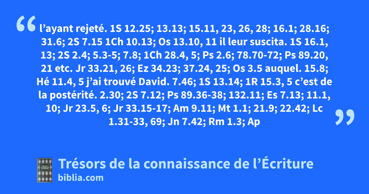 l’ayant rejeté. 1S 12.25; 13.13; 15.11, 23, 26, 28; 16.1; 28.16; 31.6; 2S 7.15 1Ch 10.13; Os 13.10, 11 il leur suscita. 1S 16.1, 13; 2S 2.4; 5.3-5; 7.8; 1Ch 28.4, 5; Ps 2.6; 78.70-72; Ps 89.20, 21 etc. Jr 33.21, 26; Ez 34.23; 37.24, 25; Os 3.5 auquel. 15.8; Hé 11.4, 5 j’ai trouvé David. 7.46; 1S 13.14; 1R 15.3, 5