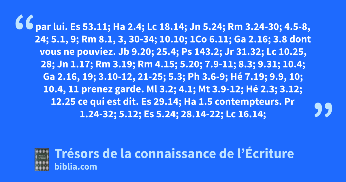 par lui. Es 53.11; Ha 2.4; Lc 18.14; Jn 5.24; Rm 3.24-30; 4.5-8, 24; 5.1, 9; Rm 8.1, 3, 30-34; 10.10; 1Co 6.11; Ga 2.16; 3.8 dont vous ne pouviez. Jb 9.20; 25.4; Ps 143.2; Jr 31.32; Lc 10.25, 28; Jn 1.17; Rm 3.19; Rm 4.15; 5.20; 7.9-11; 8.3; 9.31; 10.4; Ga 2.16, 19; 3.10-12, 21-25; 5.3; Ph 3.6-9; Hé 7.19; 9.9, 10; 10.4, 11