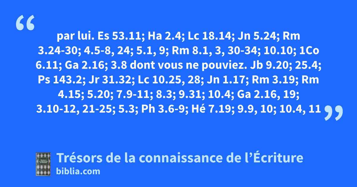 par lui. Es 53.11; Ha 2.4; Lc 18.14; Jn 5.24; Rm 3.24-30; 4.5-8, 24; 5.1, 9; Rm 8.1, 3, 30-34; 10.10; 1Co 6.11; Ga 2.16; 3.8 dont vous ne pouviez. Jb 9.20; 25.4; Ps 143.2; Jr 31.32; Lc 10.25, 28; Jn 1.17; Rm 3.19; Rm 4.15; 5.20; 7.9-11; 8.3; 9.31; 10.4; Ga 2.16, 19; 3.10-12, 21-25; 5.3; Ph 3.6-9; Hé 7.19; 9.9, 10; 10.4, 11