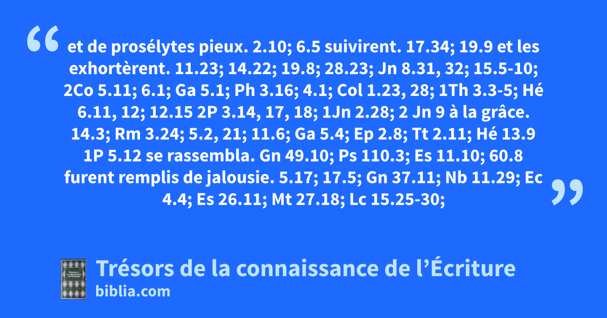 et de prosélytes pieux. 2.10; 6.5 suivirent. 17.34; 19.9 et les exhortèrent. 11.23; 14.22; 19.8; 28.23; Jn 8.31, 32; 15.5-10; 2Co 5.11; 6.1; Ga 5.1; Ph 3.16; 4.1; Col 1.23, 28; 1Th 3.3-5; Hé 6.11, 12; 12.15 2P 3.14, 17, 18; 1Jn 2.28; 2 Jn 9 à la grâce. 14.3; Rm 3.24; 5.2, 21; 11.6; Ga 5.4; Ep 2.8; Tt 2.11; Hé 13.9 1P 5.12