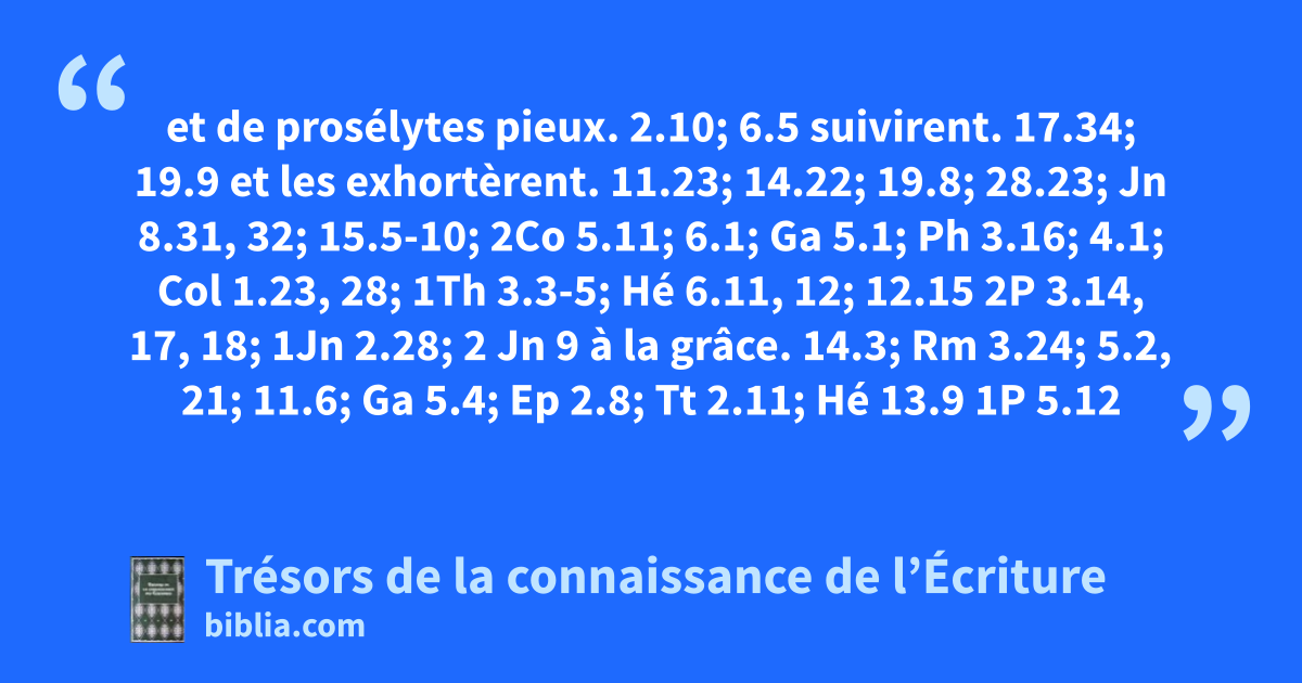 et de prosélytes pieux. 2.10; 6.5 suivirent. 17.34; 19.9 et les exhortèrent. 11.23; 14.22; 19.8; 28.23; Jn 8.31, 32; 15.5-10; 2Co 5.11; 6.1; Ga 5.1; Ph 3.16; 4.1; Col 1.23, 28; 1Th 3.3-5; Hé 6.11, 12; 12.15 2P 3.14, 17, 18; 1Jn 2.28; 2 Jn 9 à la grâce. 14.3; Rm 3.24; 5.2, 21; 11.6; Ga 5.4; Ep 2.8; Tt 2.11; Hé 13.9 1P 5.12