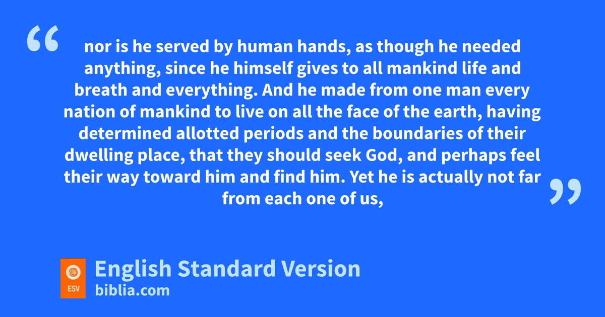 22 So Paul, standing in the midst of the Areopagus, said: “Men of Athens, I perceive that in every way you are very religious. 23 For as I passed along and observed the objects of your worship, I found also an altar with this inscription: p‘To the unknown god.’ pWhat therefore you worship qas unknown, this I proclaim to you. 24 rThe God who made the world and everything in it, being sLord of heaven and earth, tdoes not live in temples made by man,3 25 nor is he served by human hands, uas though he needed anything, since he himself vgives to all mankind wlife and breath and everything. 26 And xhe made from one man every nation of mankind to live yon all the face of the earth, zhaving determined allotted periods and athe boundaries of their dwelling place, 27 bthat they should seek God, cand perhaps feel their way toward him and find him. dYet he is actually not far from each one of us, 28 for