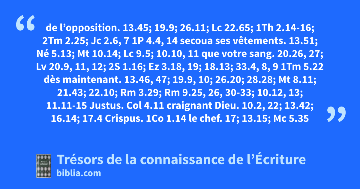 de l’opposition. 13.45; 19.9; 26.11; Lc 22.65; 1Th 2.14-16; 2Tm 2.25; Jc 2.6, 7 1P 4.4, 14 secoua ses vêtements. 13.51; Né 5.13; Mt 10.14; Lc 9.5; 10.10, 11 que votre sang. 20.26, 27; Lv 20.9, 11, 12; 2S 1.16; Ez 3.18, 19; 18.13; 33.4, 8, 9 1Tm 5.22 dès maintenant. 13.46, 47; 19.9, 10; 26.20; 28.28; Mt 8.11; 21.43; 22.10; Rm 3.29; Rm 9.25, 26, 30-33; 10.12, 13; 11.11-15