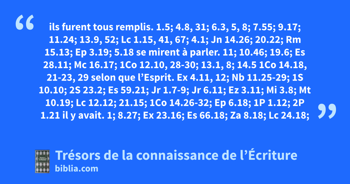 ils furent tous remplis. 1.5; 4.8, 31; 6.3, 5, 8; 7.55; 9.17; 11.24; 13.9, 52; Lc 1.15, 41, 67; 4.1; Jn 14.26; 20.22; Rm 15.13; Ep 3.19; 5.18 se mirent à parler. 11; 10.46; 19.6; Es 28.11; Mc 16.17; 1Co 12.10, 28-30; 13.1, 8; 14.5 1Co 14.18, 21-23, 29 selon que l’Esprit. Ex 4.11, 12; Nb 11.25-29; 1S 10.10; 2S 23.2; Es 59.21; Jr 1.7-9; Jr 6.11; Ez 3.11; Mi 3.8; Mt 10.19; Lc 12.12; 21.15; 1Co 14.26-32; Ep 6.18; 1P 1.12; 2P 1.21