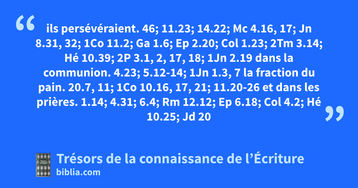 ils persévéraient. 46; 11.23; 14.22; Mc 4.16, 17; Jn 8.31, 32; 1Co 11.2; Ga 1.6; Ep 2.20; Col 1.23; 2Tm 3.14; Hé 10.39; 2P 3.1, 2, 17, 18; 1Jn 2.19 dans la communion. 4.23; 5.12-14; 1Jn 1.3, 7 la fraction du pain. 20.7, 11; 1Co 10.16, 17, 21; 11.20-26 et dans les prières. 1.14; 4.31; 6.4; Rm 12.12; Ep 6.18; Col 4.2; Hé 10.25; Jd 20