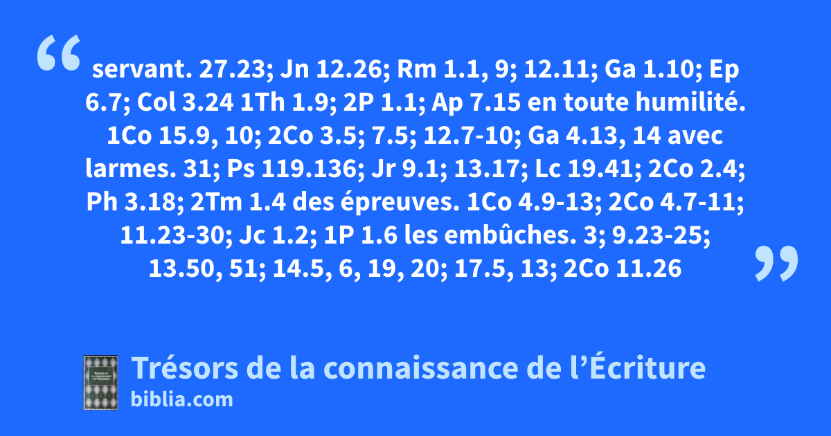 servant. 27.23; Jn 12.26; Rm 1.1, 9; 12.11; Ga 1.10; Ep 6.7; Col 3.24 1Th 1.9; 2P 1.1; Ap 7.15 en toute humilité. 1Co 15.9, 10; 2Co 3.5; 7.5; 12.7-10; Ga 4.13, 14 avec larmes. 31; Ps 119.136; Jr 9.1; 13.17; Lc 19.41; 2Co 2.4; Ph 3.18; 2Tm 1.4 des épreuves. 1Co 4.9-13; 2Co 4.7-11; 11.23-30; Jc 1.2; 1P 1.6 les embûches. 3; 9.23-25; 13.50, 51; 14.5, 6, 19, 20; 17.5, 13; 2Co 11.26