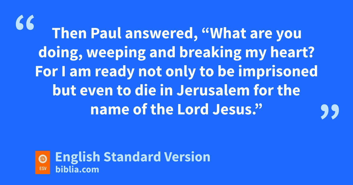 7 When we had finished the voyage from Tyre, we arrived at Ptolemais, and we greeted xthe brothers2 and stayed with them for one day. 8 On the next day we departed and came to Caesarea, and we entered the house of yPhilip zthe evangelist, who was one of the seven, and stayed with him. 9 He had four unmarried daughters, awho prophesied. 10 While we were staying for many days, a prophet named bAgabus came down from Judea. 11 And coming to us, he ctook Paul’s belt and bound his own feet and hands and said, d“Thus says the Holy Spirit, e‘This is how the Jews3 at Jerusalem will bind the man who owns this belt and fdeliver him into the hands of the Gentiles.’ ” 12 When we heard this, we and the people there gurged him not to go up to Jerusalem. 13 Then Paul answered, g“What are you doing, weeping and breaking my heart? For hI am ready not only to be imprisoned but even to die in Jerusalem ifor the name of the Lord Jesus.” 14 And since he would not be persuaded, jwe ceased and said, k“Let the will of the Lord be done.”
