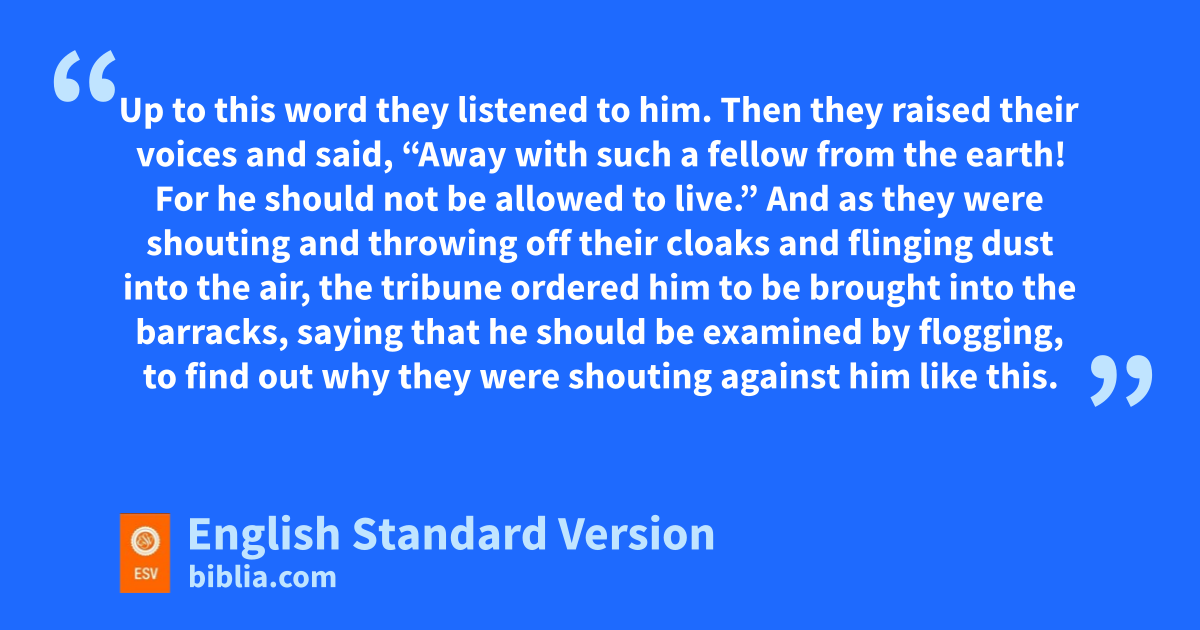 22 Up to this word they listened to him. Then they raised their voices and said, n“Away with such a fellow from the earth! For ohe should not be allowed to live.” 23 And as they were shouting and throwing off their cloaks and flinging dust into the air, 24 the tribune ordered him to be brought into pthe barracks, saying that he should be qexamined by flogging, to find out why they were shouting against him like this. 25 But when they had stretched him out for the whips,4 Paul said to the centurion who was standing by, “Is it lawful for you to flog ra man who is a Roman citizen and uncondemned?” 26 When the centurion heard this, he went to the tribune and said to him, “What are you about to do? For this man is a Roman citizen.” 27 So the tribune came and said to him, “Tell me, are you a Roman citizen?” And he said, “Yes.” 28 The tribune answered, “I bought this citizenship for a large sum.” Paul said, “But I am a citizen by birth.” 29 So those who were about sto examine him withdrew from him immediately, and the tribune also twas afraid, ufor he realized that Paul was a Roman citizen and that vhe had bound him.