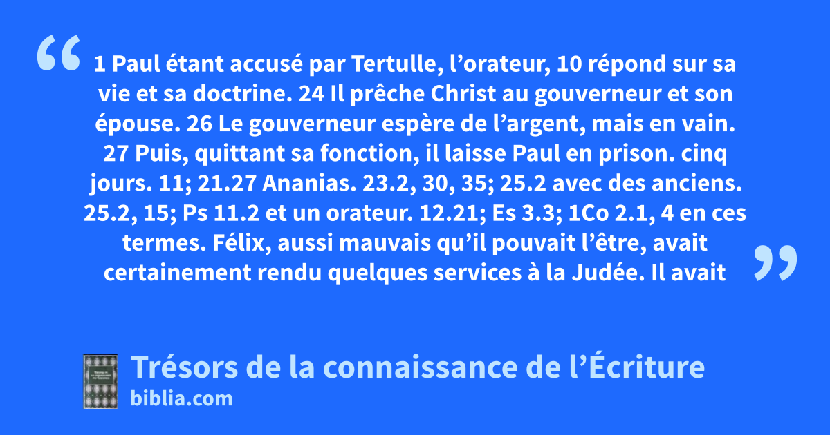 1 Paul étant accusé par Tertulle, l’orateur, 10 répond sur sa vie et sa doctrine. 24 Il prêche Christ au gouverneur et son épouse. 26 Le gouverneur espère de l’argent, mais en vain. 27 Puis, quittant sa fonction, il laisse Paul en prison.