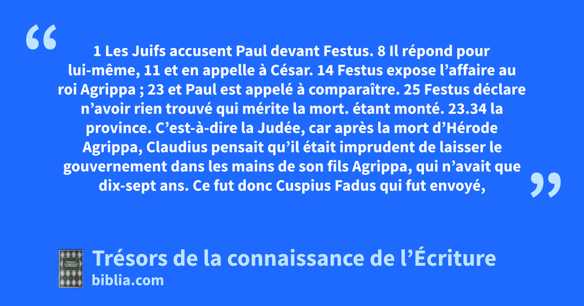1 Les Juifs accusent Paul devant Festus. 8 Il répond pour lui-même, 11 et en appelle à César. 14 Festus expose l’affaire au roi Agrippa ; 23 et Paul est appelé à comparaître. 25 Festus déclare n’avoir rien trouvé qui mérite la mort.