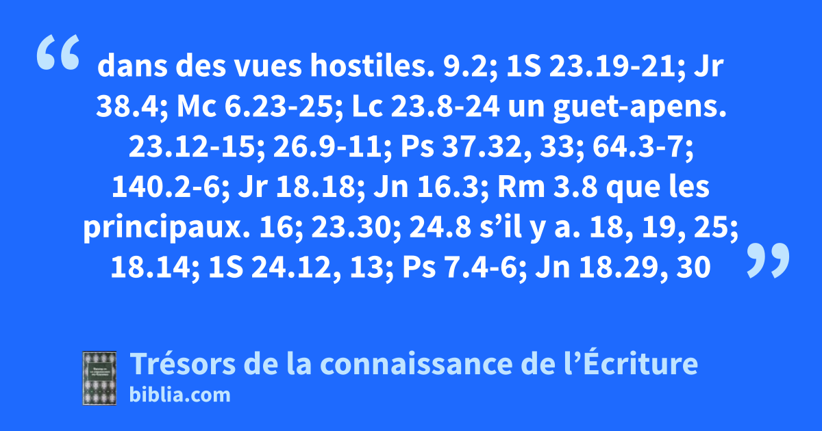dans des vues hostiles. 9.2; 1S 23.19-21; Jr 38.4; Mc 6.23-25; Lc 23.8-24 un guet-apens. 23.12-15; 26.9-11; Ps 37.32, 33; 64.3-7; 140.2-6; Jr 18.18; Jn 16.3; Rm 3.8