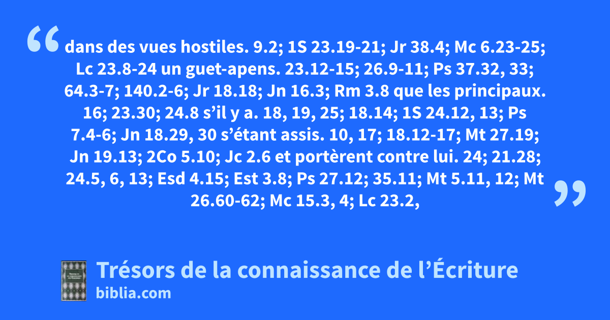dans des vues hostiles. 9.2; 1S 23.19-21; Jr 38.4; Mc 6.23-25; Lc 23.8-24 un guet-apens. 23.12-15; 26.9-11; Ps 37.32, 33; 64.3-7; 140.2-6; Jr 18.18; Jn 16.3; Rm 3.8