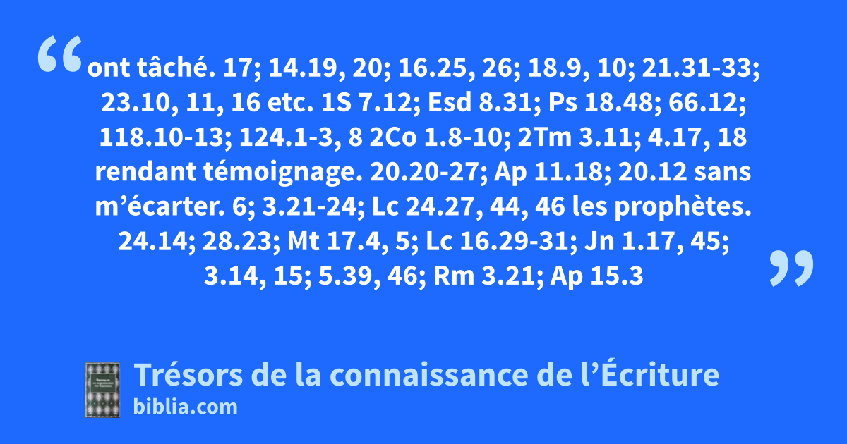 ont tâché. 17; 14.19, 20; 16.25, 26; 18.9, 10; 21.31-33; 23.10, 11, 16 etc. 1S 7.12; Esd 8.31; Ps 18.48; 66.12; 118.10-13; 124.1-3, 8 2Co 1.8-10; 2Tm 3.11; 4.17, 18 rendant témoignage. 20.20-27; Ap 11.18; 20.12 sans m’écarter. 6; 3.21-24; Lc 24.27, 44, 46 les prophètes. 24.14; 28.23; Mt 17.4, 5; Lc 16.29-31; Jn 1.17, 45; 3.14, 15; 5.39, 46; Rm 3.21; Ap 15.3