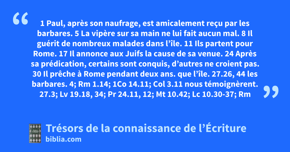 1 Paul, après son naufrage, est amicalement reçu par les barbares. 5 La vipère sur sa main ne lui fait aucun mal. 8 Il guérit de nombreux malades dans l’île. 11 Ils partent pour Rome. 17 Il annonce aux Juifs la cause de sa venue. 24 Après sa prédication, certains sont conquis, d’autres ne croient pas. 30 Il prêche à Rome pendant deux ans.