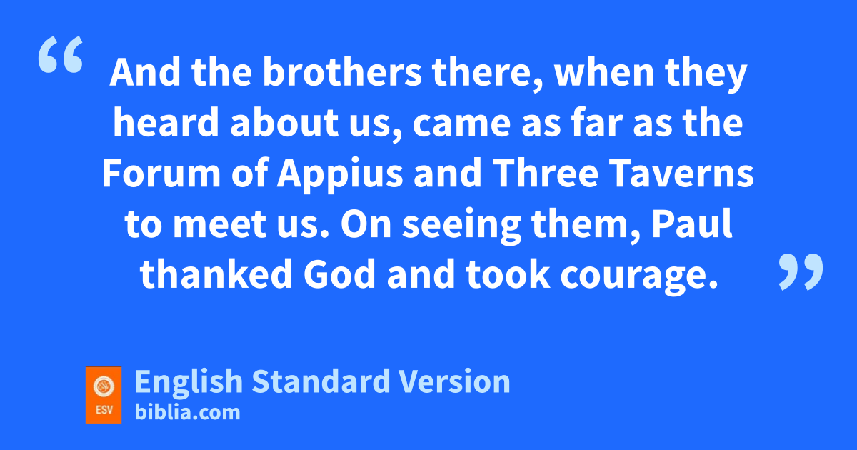 11 After three months we set sail in xa ship that had wintered in the island, a ship of Alexandria, with the twin gods4 as a figurehead. 12 Putting in at Syracuse, we stayed there for three days. 13 And from there we made a circuit and arrived at Rhegium. And after one day a south wind sprang up, and on the second day we came to Puteoli. 14 There we found ybrothers5 and were invited to stay with them for seven days. And so we came to Rome. 15 And ythe brothers there, when they heard about us, came as far as the Forum of Appius and Three Taverns to meet us. On seeing them, zPaul thanked God and took courage. 16 And when we came into Rome, aPaul was allowed to stay by himself, with the soldier who guarded him.