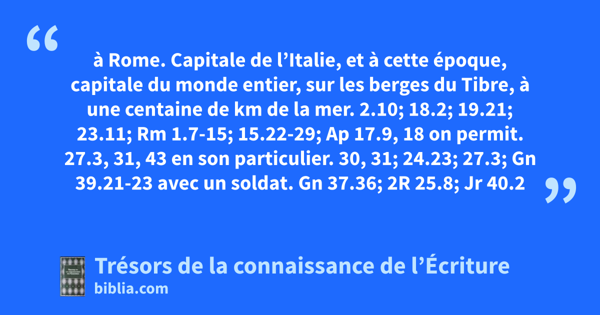 à Rome. Capitale de l’Italie, et à cette époque, capitale du monde entier, sur les berges du Tibre, à une centaine de km de la mer. 2.10; 18.2; 19.21; 23.11; Rm 1.7-15; 15.22-29; Ap 17.9, 18 on permit. 27.3, 31, 43 en son particulier. 30, 31; 24.23; 27.3; Gn 39.21-23 avec un soldat. Gn 37.36; 2R 25.8; Jr 40.2