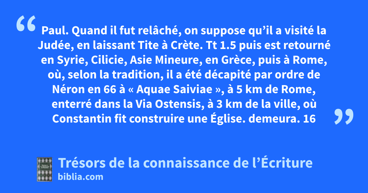 Paul. Quand il fut relâché, on suppose qu’il a visité la Judée, en laissant Tite à Crète. Tt 1.5 puis est retourné en Syrie, Cilicie, Asie Mineure, en Grèce, puis à Rome, où, selon la tradition, il a été décapité par ordre de Néron en 66 à « Aquae Saiviae », à 5 km de Rome, enterré dans la Via Ostensis, à 3 km de la ville, où Constantin fit construire une Église. demeura. 16